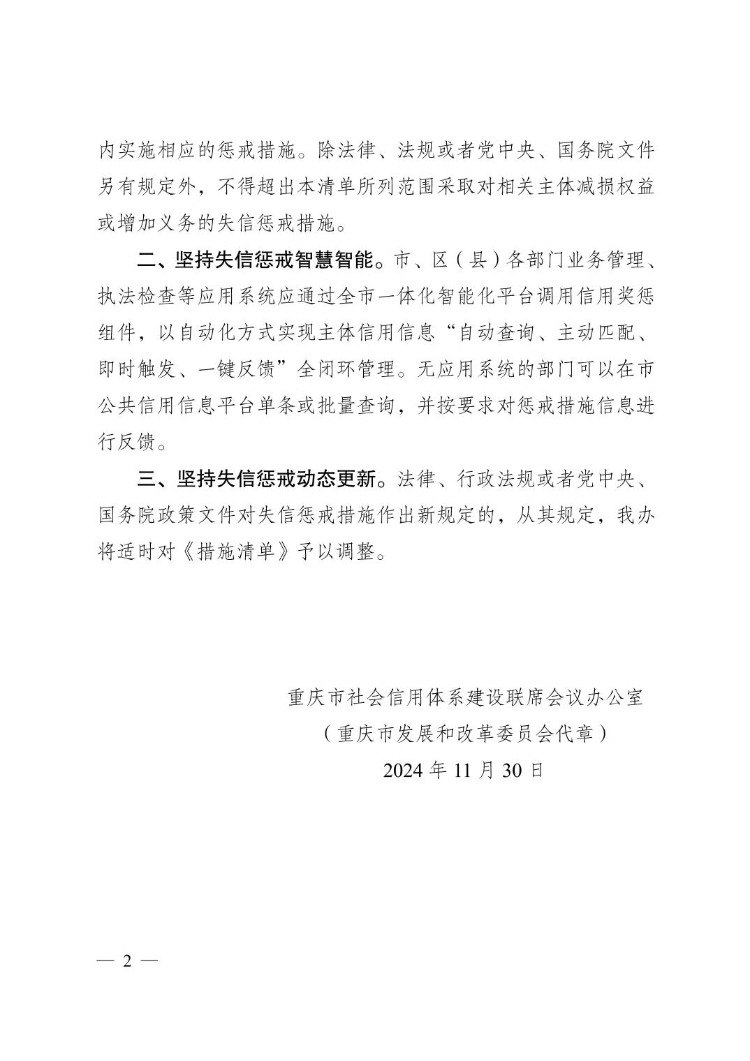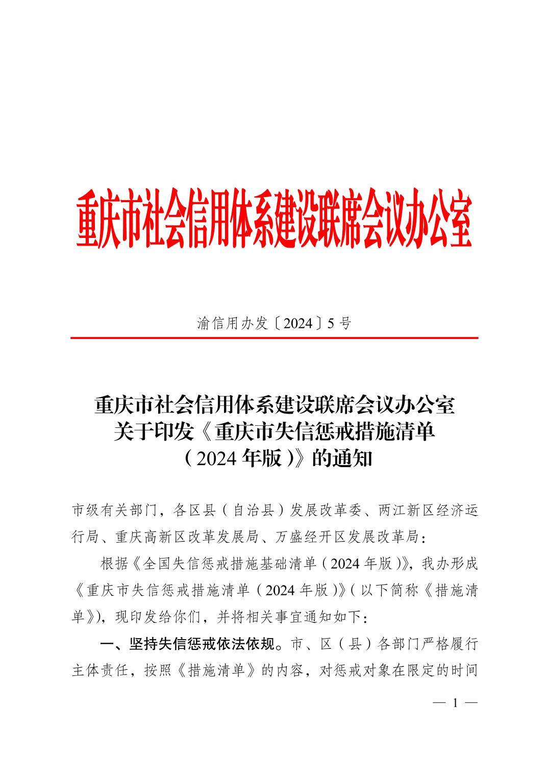 重庆市社会信用体系建设联席会议办公室关于印发《重庆市失信惩戒措施清单 (2024 年版) 》的通知_在线博彩-在线体育博彩