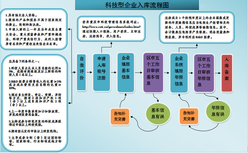 科技型企业入库有自我评价、申请入库账号注册、企业填报基本信息、区市五个工作日审核基本信息、企业系统填报年报信息、区市五个工作日审核年报信息、入库备案等流程,具体流程请参照科技型企业入库流程图。