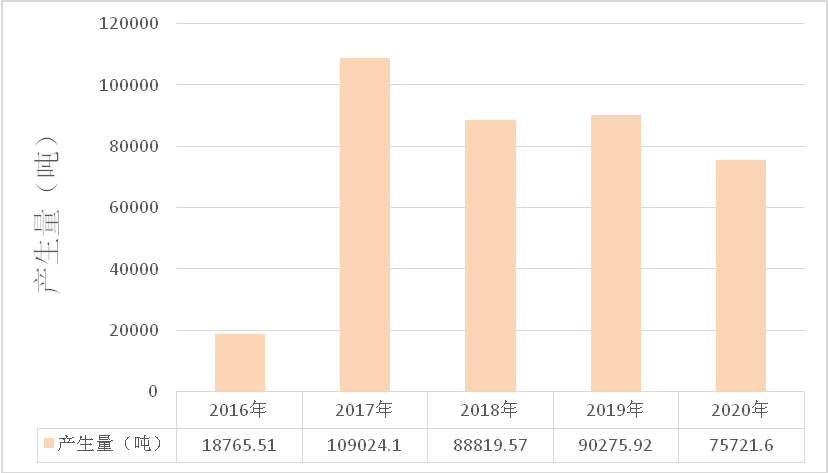 2016—2020年,全区一般工业固体废物产生量呈现逐年波动的趋势,在2017年出现高峰,为109024.1吨。2020年,全区一般工业固体废物产生量约为75721.60吨,仅占全市一般工业固体废物产生总量2272.1万吨的0.33%,可见,在线博彩 一般工业固体废物产生量在全市的占比较小。