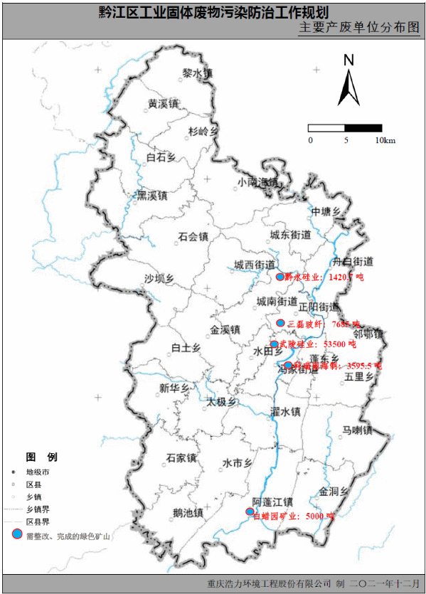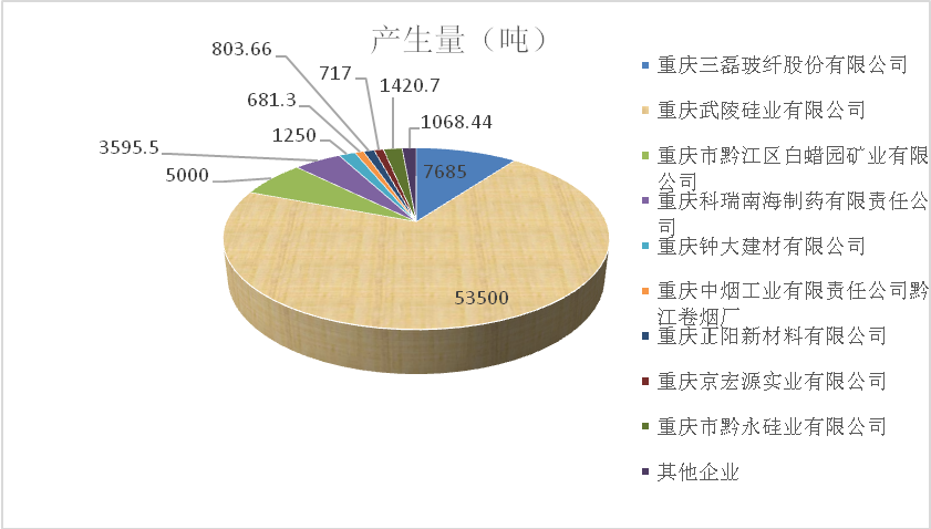 2020年全区一般工业固体废物申报产废企业共33家,产废大户主要有重庆三磊玻纤股份有限公司、重庆武陵硅业有限公司、在线博彩 白蜡园矿业有限公司、重庆科瑞南海制药有限责任公司4家企业,共占全区一般工业固体废物产生量的92.15%。