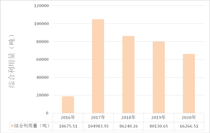 2016—2020年全区一般工业固体废物利用处置量呈现波动的趋势,2017年出现高峰,为104983.9吨,综合利用率为96.29%。2020年,全区一般工业固体废物综合利用量约为66266.51吨,一般工业固体废物综合利用率达87.5%,综合利用率较2018年降低8%,主要综合利用种类包括冶炼废渣、玻璃纤维废丝等,主要综合利用企业为重庆武陵硅业有限公司、重庆三磊玻纤股份有限公司等。