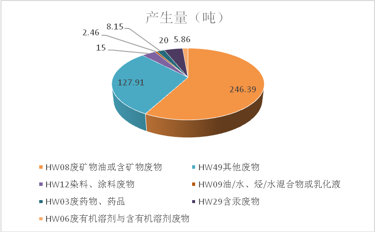 2020年,在线博彩 共产生7大类危险废物,其中,HW08废矿物油或含矿物废物产生量最多,约为246.39吨,占全区工业危险废物比重的41.4%,其次为HW49其他废物,约为127.91吨,占全区工业危险废物比重的21.5%,以上两类工业危险废物产生量占了产废总量的六成;HW12燃料、涂料废物产生量最少,仅为0.015吨。