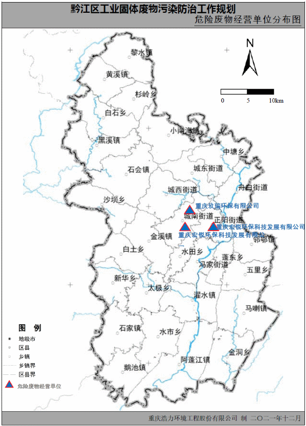 区内共有2家工业危险废物经营单位,为重庆宏锐环保科技发展有限公司、重庆玖瑞环保有限公司。其中,处置单位1家,处置能力分别为1095吨/年,收集单位1家,收集能力5810吨/年。