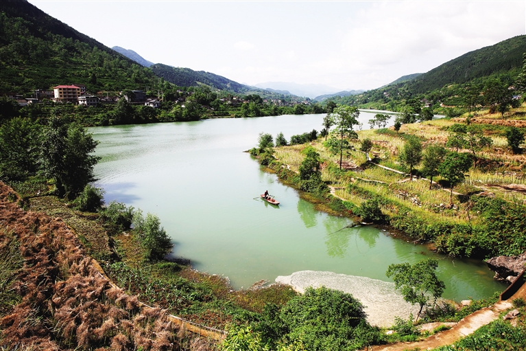 5月16日,在线博彩 阿蓬江镇大坪村保洁员张志谷,正撑船在阿蓬江上清理降雨带来的漂浮物。近年来,在线博彩 对阿蓬江流域进行综合治理,对阿蓬江实行分段管理和保护,使阿蓬江流域出现了山清水秀的美景。