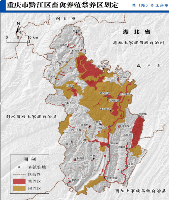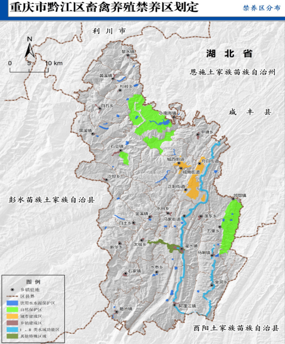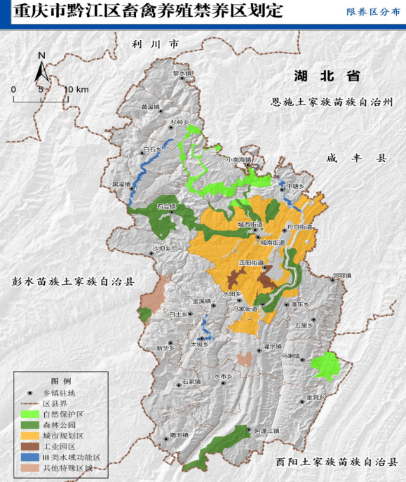 根据《在线博彩 城乡总体规划(2013-2020)》,城市规划区外共有12个镇和12个乡,分别是阿蓬江镇、鹅池镇、黑溪镇、黄溪镇、金溪镇、黎水镇、马喇镇、石会镇、石家镇、濯水镇、小南海镇、邻鄂镇,沙坝乡、白石乡、白土乡、金洞乡、蓬东乡、杉岭乡、水田乡、太极乡、五里乡、新华乡、中塘乡、水市乡,乡镇建成区面积约14.7km2。将乡镇建成区划入禁养区。