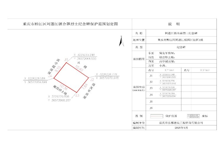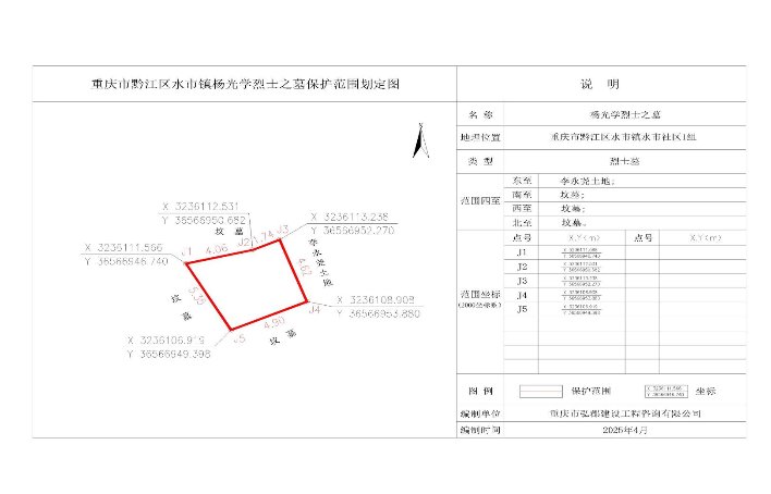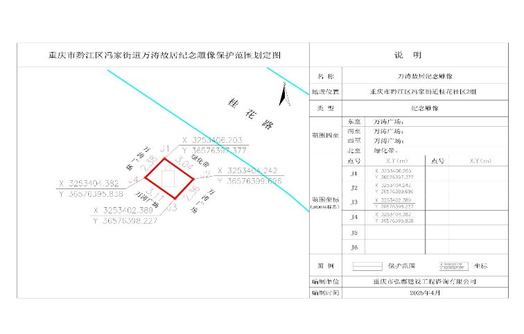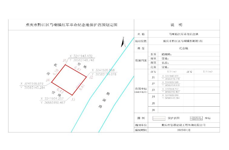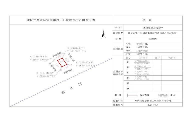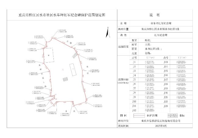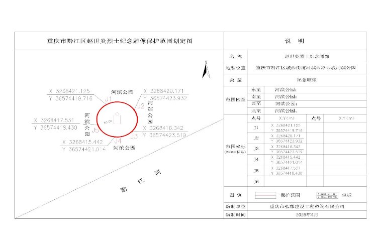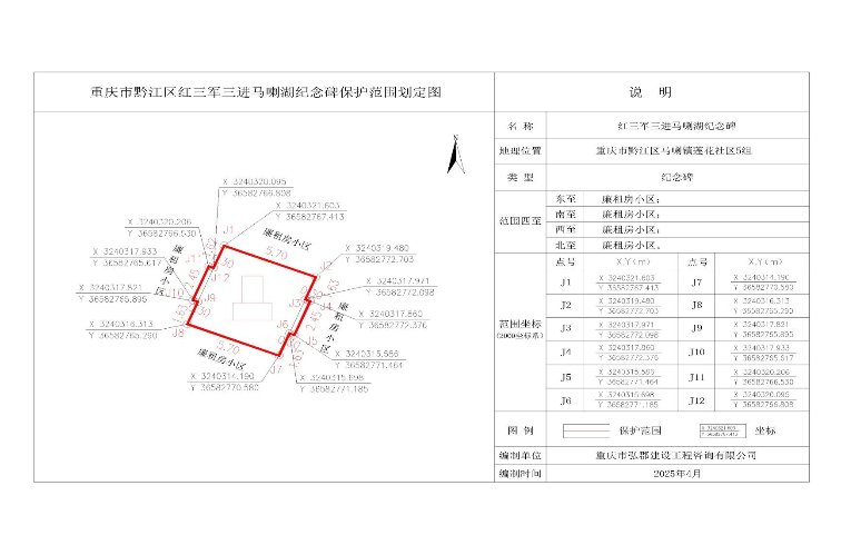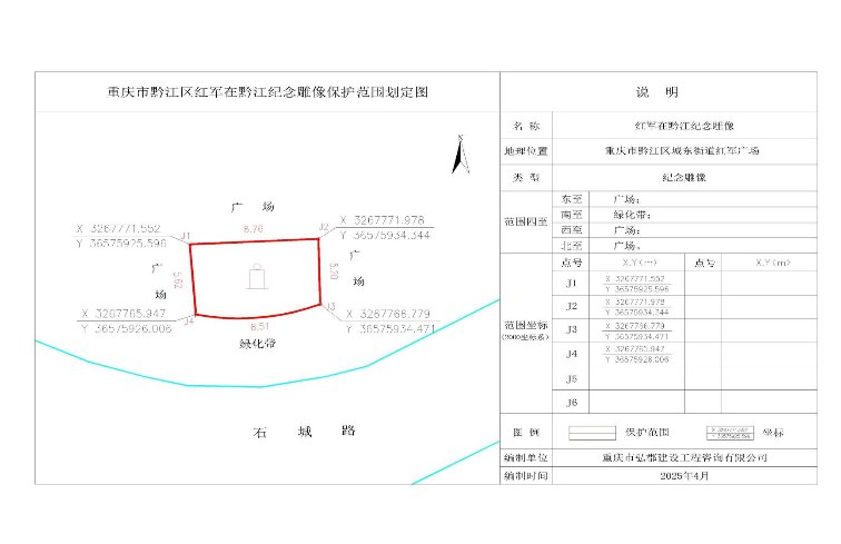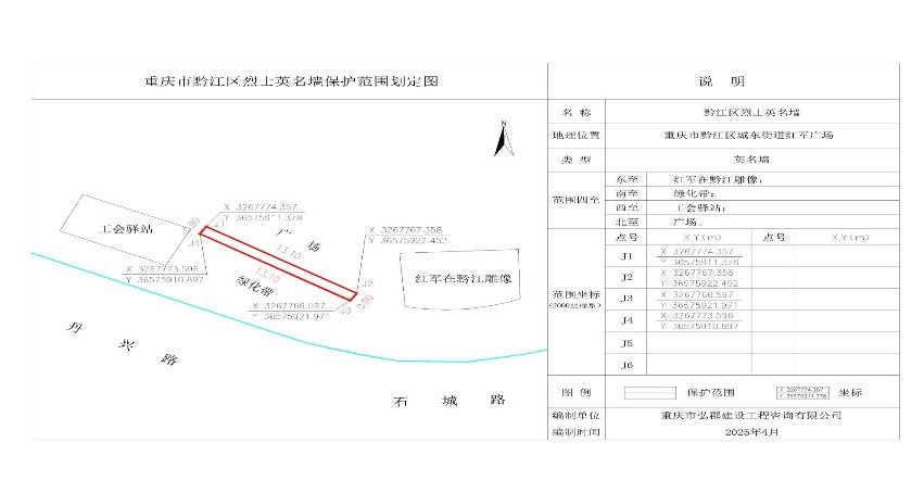 保护范围:东以红军在黔江雕塑为界;南以绿化带为界;西以工会驿站为界;北以广场为界。