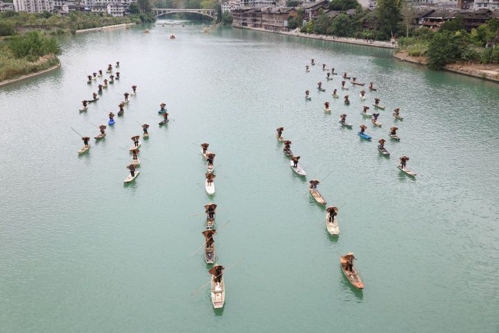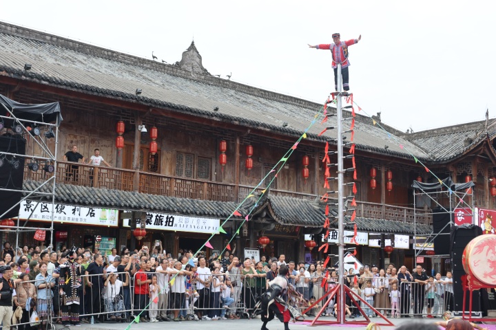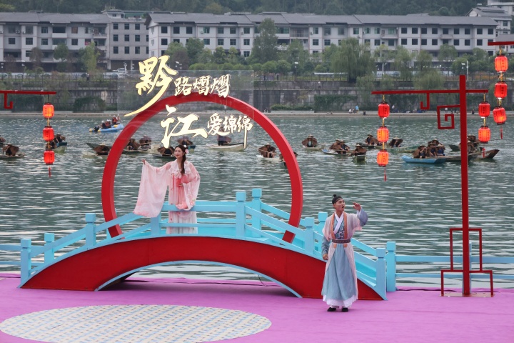 围绕“黔路熠熠·江爱绵绵”这一主题,本届鹊桥会设置了精彩纷呈的节目展演,分别用“仪式篇、行进篇、主题篇”三个演出篇章进行串联,同时聚焦濯水古镇白虎广场、水师码头等核心空间,为游客打造了一场360°沉浸式全景演出。
