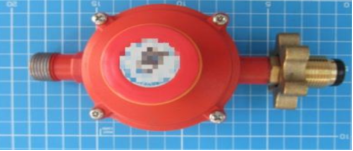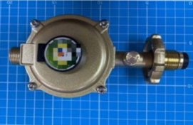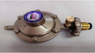 瓶装液化石油气调压器是在进口压力、流量和温度范围内, 始终保持出口压力处于预设范围内的装置,分为家用和商用两种。家用瓶装液化石油气调压器如图4—1,商用瓶装液化石油气调压器如图4—2。商用类一般为桔红色,且较家用类体积更大。