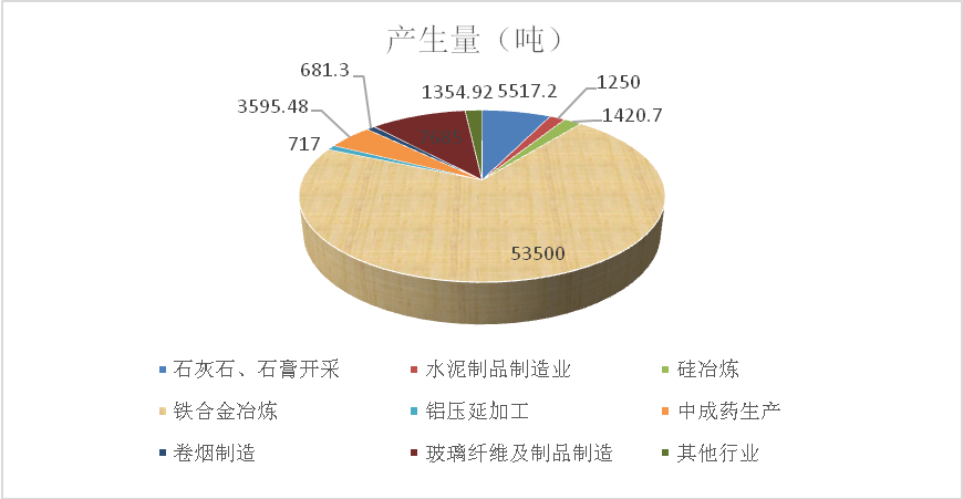2020年全区共有18个大类行业产生一般工业固体废物,其中铁合金冶炼制造行业一般工业固体废物产生量最多,为53500吨,约占全区一般工业固体废物产生量的70.65%,其次是硅冶炼制造、铝压延加工行业,这3个行业约占全区一般工业固体废物产生总量的73.5%,可见,在线博彩 一般工业固体废物行业集中度较高。