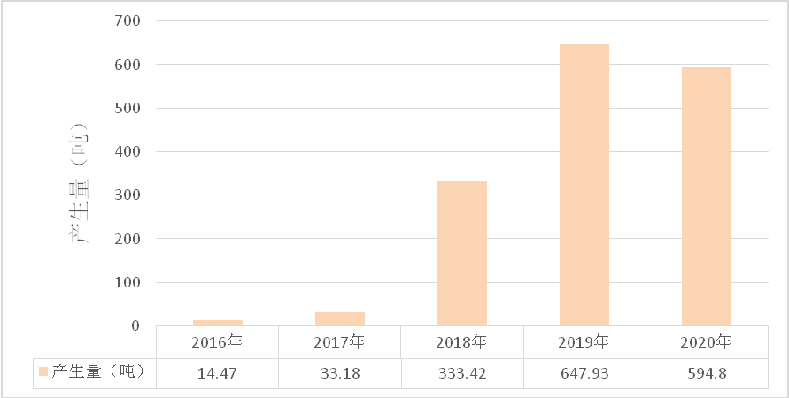 2016—2020年,全区工业危险废物产生量大致呈逐年增加的趋势。2016—2017年,危险废物产生量较低,主要是受到申报产废企业不全所致。2020年,全区工业危险废物产生量约为594.8吨,仅占全市工业危险废物产生总量83.5万吨的0.07%,可见,在线博彩 工业危险废物在全市的占比较小。