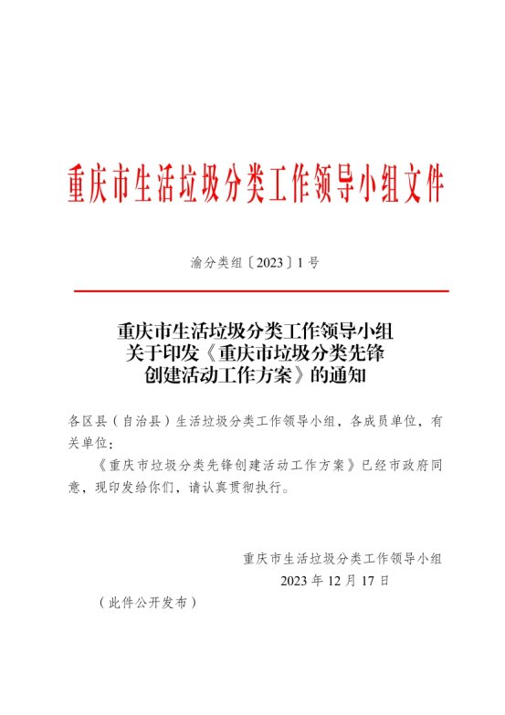 现将《重庆市生活垃圾分类工作领导小组关于印发<重庆市垃圾分类先锋创建活动工作方案>的通知》(渝分类组〔2023〕1号)转给你们,请认真学习,结合实际积极组织开展重庆市垃圾分类先锋创建活动。